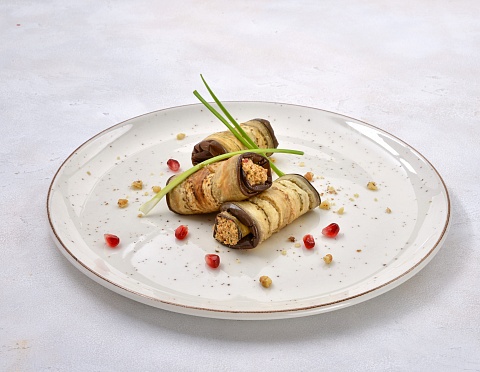 Рулетики из жареных баклажанов с начинкой из ореховой пасты с зернами граната