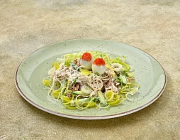 Отварное филе говядины и куры, огурцы свежие, лук порей, перепелиное яйцо, зелень, соус