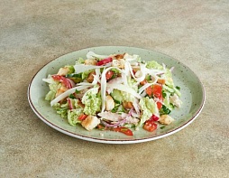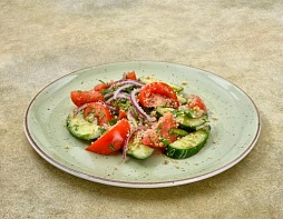 Огурцы свежие, томаты свежие, перец болгарский, красный лук, зелень, заправка