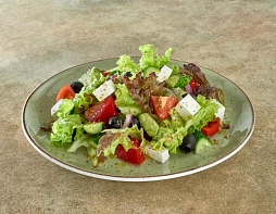 Листья салата "Айсберг", томаты, огурцы, болгарский перец - свежие, маслины, сыр "Фета", заправка         ...