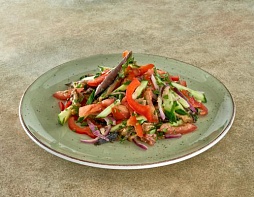 Запеченные  баклажаны  и болгарский перец, красный лук, свежие огурцы, заправка с грецким орехом, зелень, заправка      ...