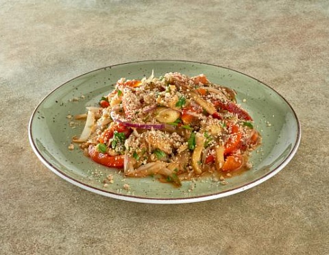 Запеченные баклажаны и болгарский перец, красный лук, свежие огурцы, заправка с грецким орехом, зелень, заправка