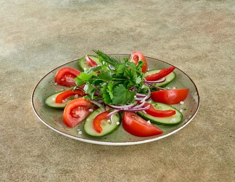 Огурцы свежие, томаты свежие, перец болгарский, красный лук, зелень, заправка
