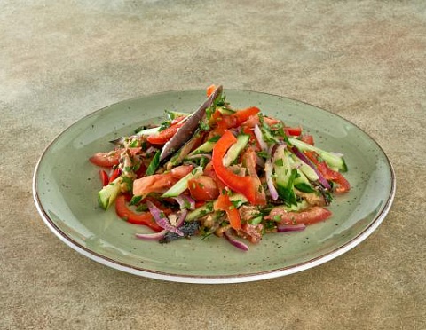 Запеченные баклажаны, свежие огурцы, перец болгарский, красный лук, зелень, заправка