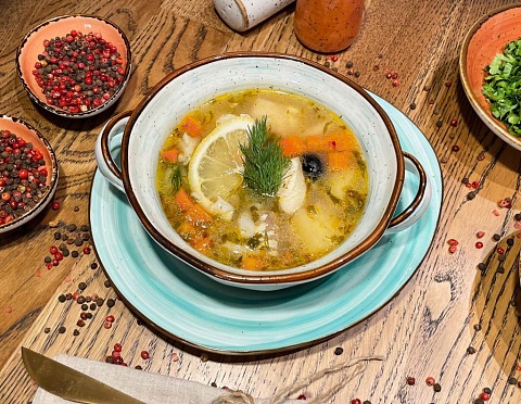 Рыбный бульон, филе белой рыбы, картофель, морковь, лук репчатый, специи